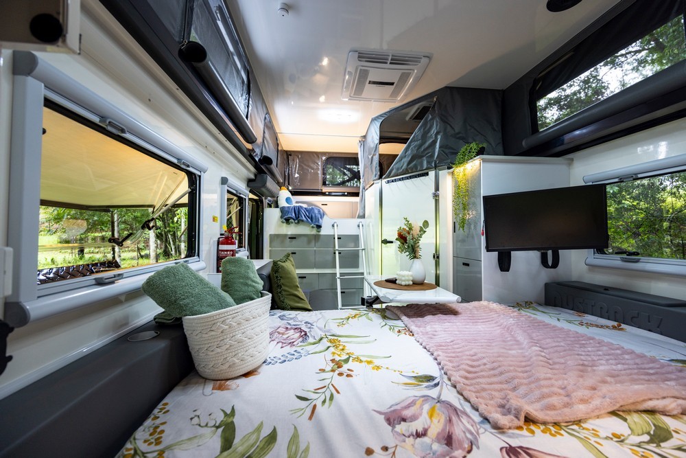Designed for Off-road adventures, this model includes robust suspension, a roomy interior, and convenient bunk beds for the kids.