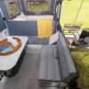 Waterproof Composite board with Modern timber laminate finish. Under seating storage cabinets & portable folding table with surrounding couches that converts to a second bedroom.