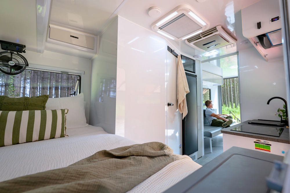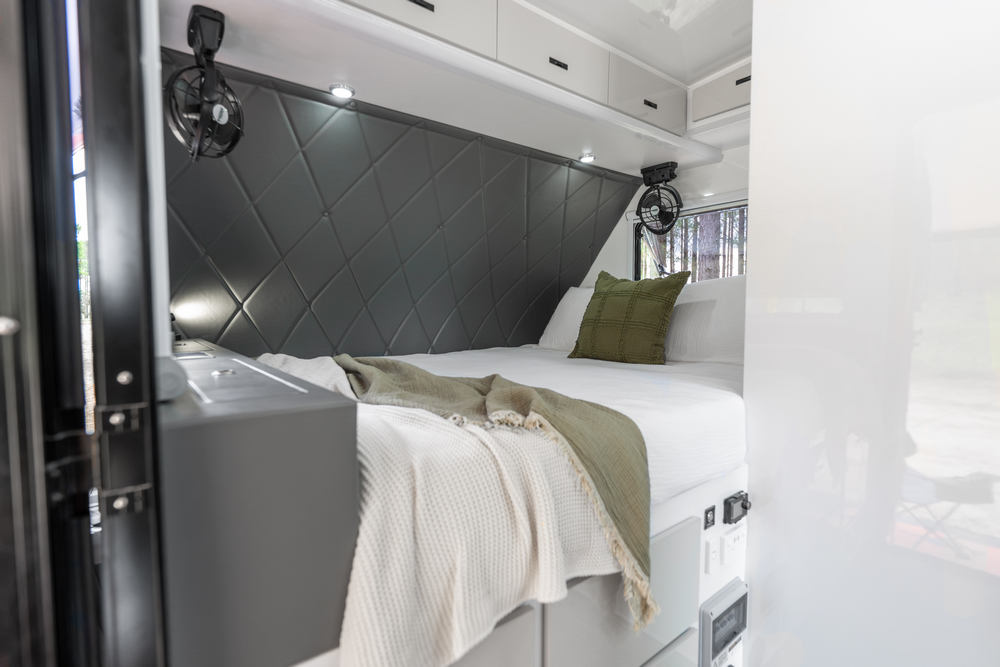 Inside, enjoy a comfortable queen bed, bunk seats that convert to bench seating, and a full internal ensuite for added convenience. Climate comfort is covered with reverse cycle air conditioning and a diesel heater, while ample solar and battery capacity keep you powered off grid. A fully equipped kitchen and electric systems throughout make setup simple and day to day living effortless.