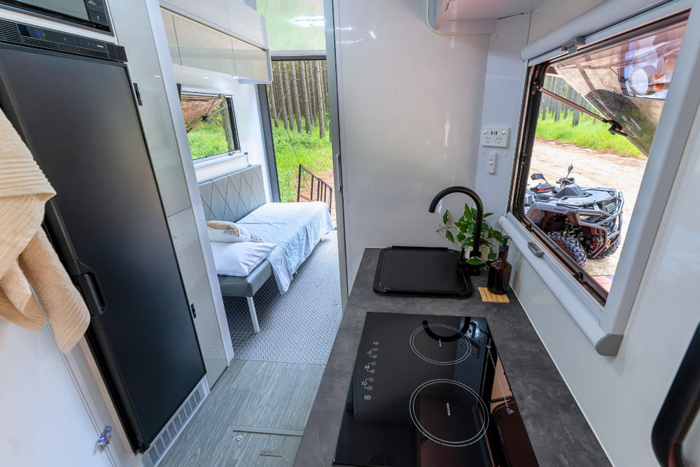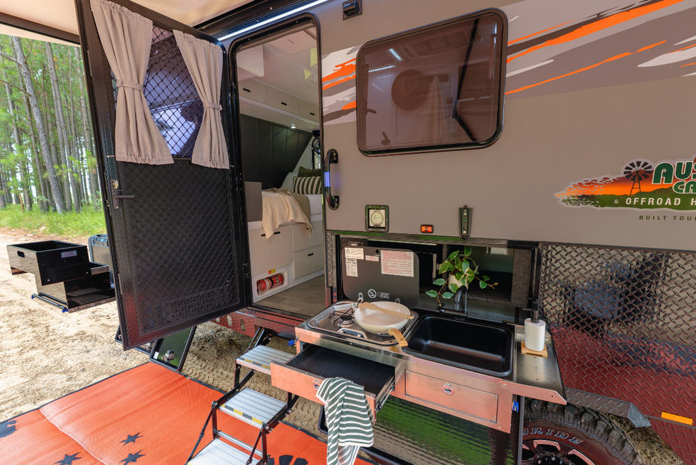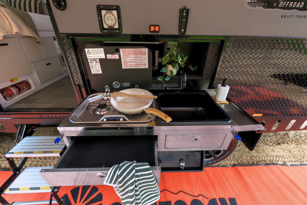 Pull out stainless steel kitchen with cutlery drawer, hot & cold tap, large sink & AGA approved multi-burner cooktop. Multiple storage compartments.