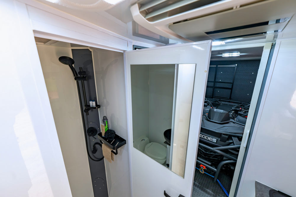 Truma Water ultra rapid Gas/electric water heater. Full internal bathroom with electric flushing toilet (external removable cassette), vanity sink with mirror & fully adjustable shower rose & shower curtain. External hot/cold RV Side Mounted Shower Tent.