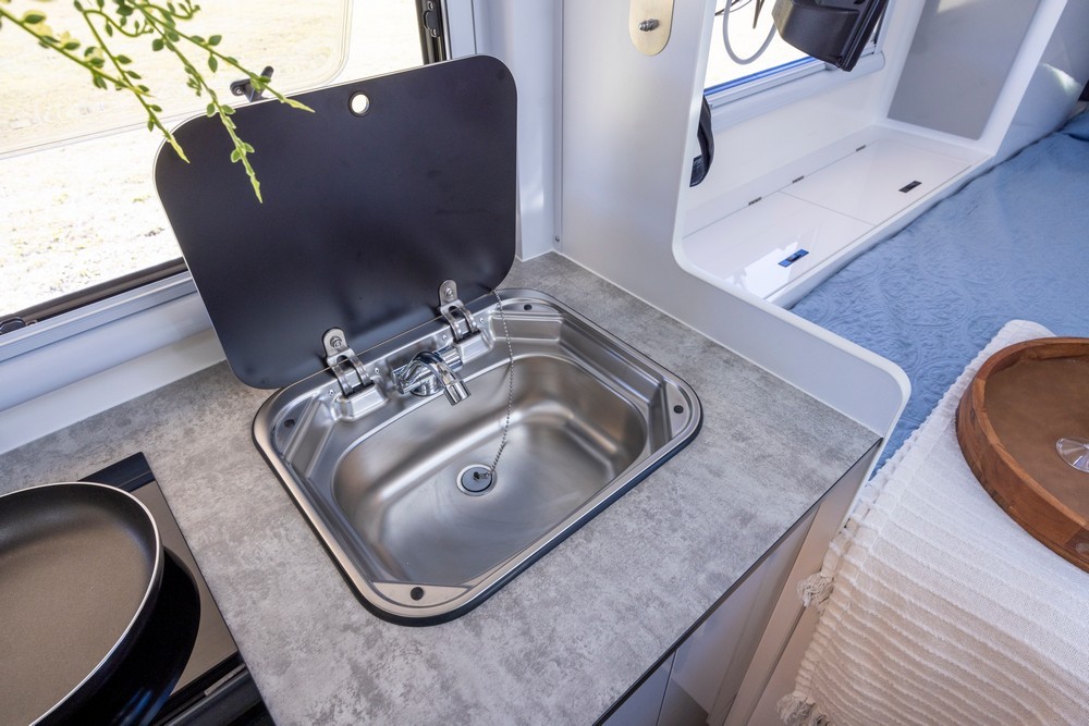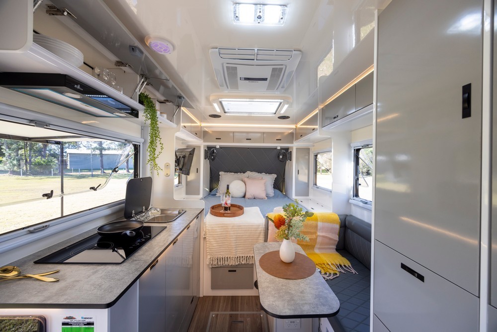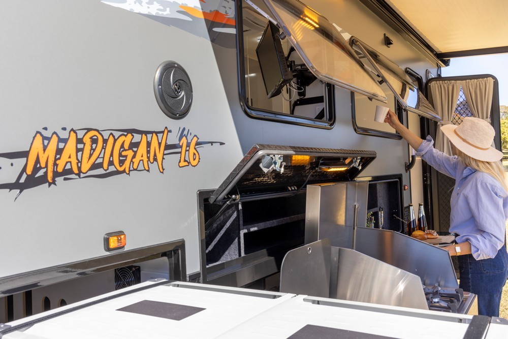 With the Madigan 16, you can enjoy delicious meals no matter where your journey takes you. The camper features fully equipped internal and external kitchens, allowing you to cook comfortably in any weather.