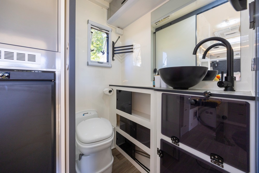 - Full Internal Bathroom: Includes an electric flushing toilet and adjustable shower.