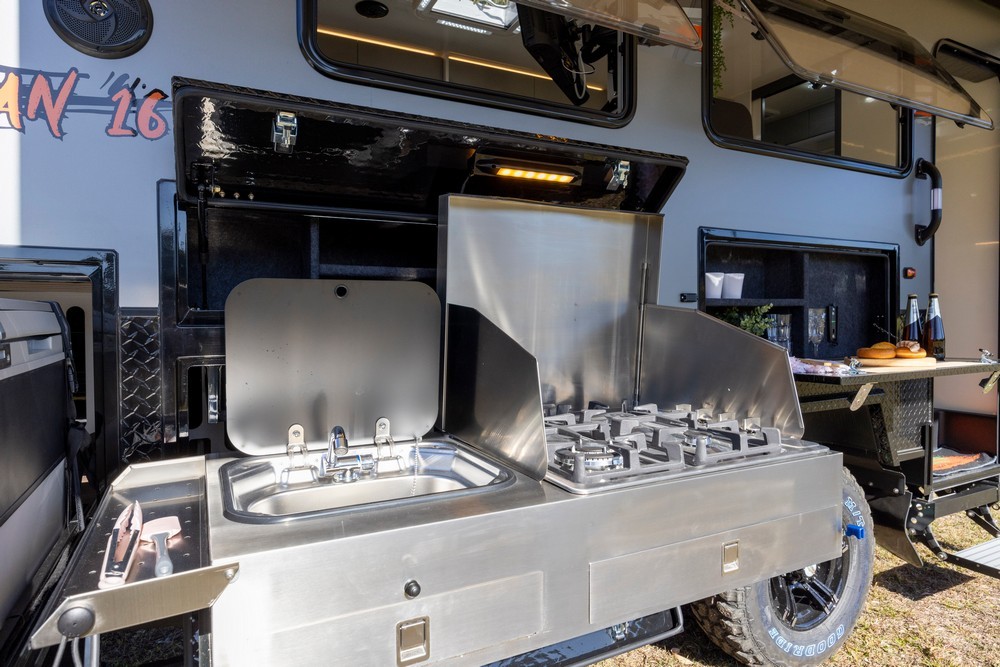 - External Pull-Out Stainless Steel Kitchen: Features a large sink and multi-burner stovetop for convenient meal preparation.