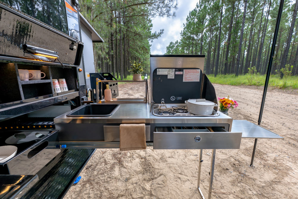 Designed for the ultimate outdoor experience, this pull-out stainless steel kitchen is built for campsite cooking at its finest. Featuring a convenient cutlery drawer, hot & cold tap, large sink, and an AGA-approved multi-burner cooktop, it's ready for everything from a quick brew to a gourmet campfire feast.