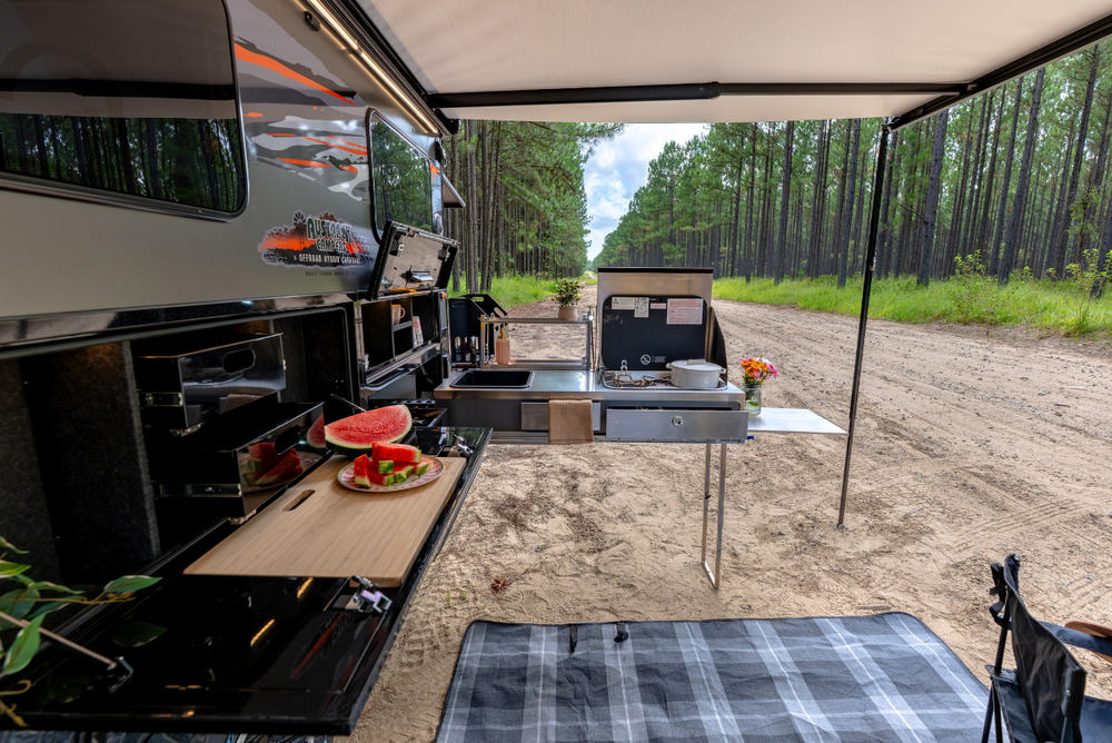 Cook Like a MasterChef: Boast your culinary skills on the external slide-out kitchen, complete with multi-burner stovetop, sink, and extra storage pantry. And hey, ever tried seasoning under bug repellant lights? Game-changer!