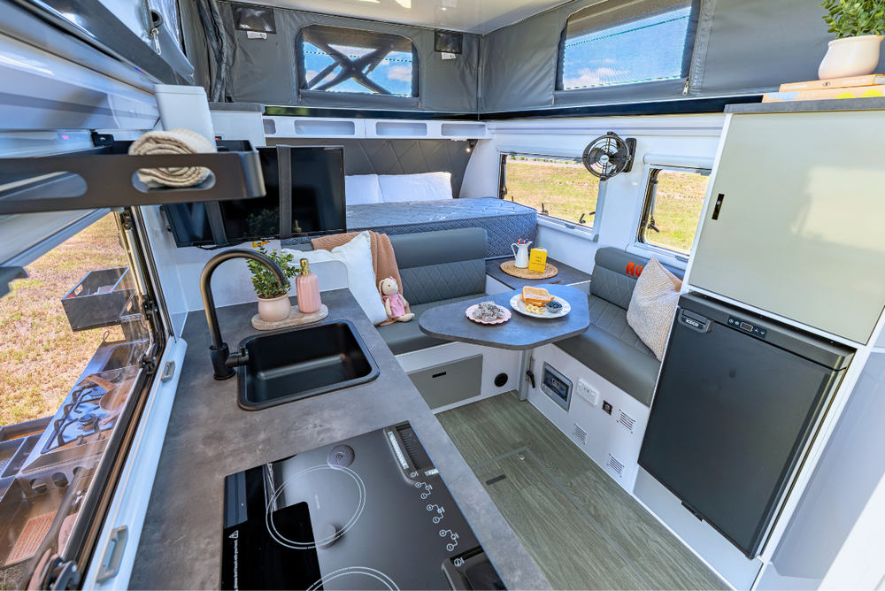 Electric Roof Roof Mounted Air Conditioner Internal fridge Benchtop Wireless Mobile Phone Charger Electric PVC waterproof awning: 5.0M x 2.5M Multiple gas outlets to allow for kitchen plumbing & also a spare for a BBQ. SMART TV with interior & exterior mounts & connections. Anti-flap kit with three side walls & draft skirt MP5 Stereo. Internal + External Speakers.