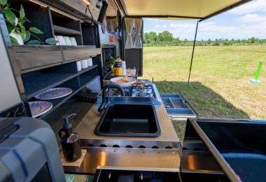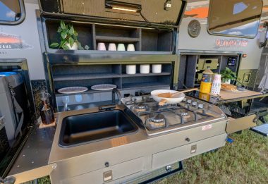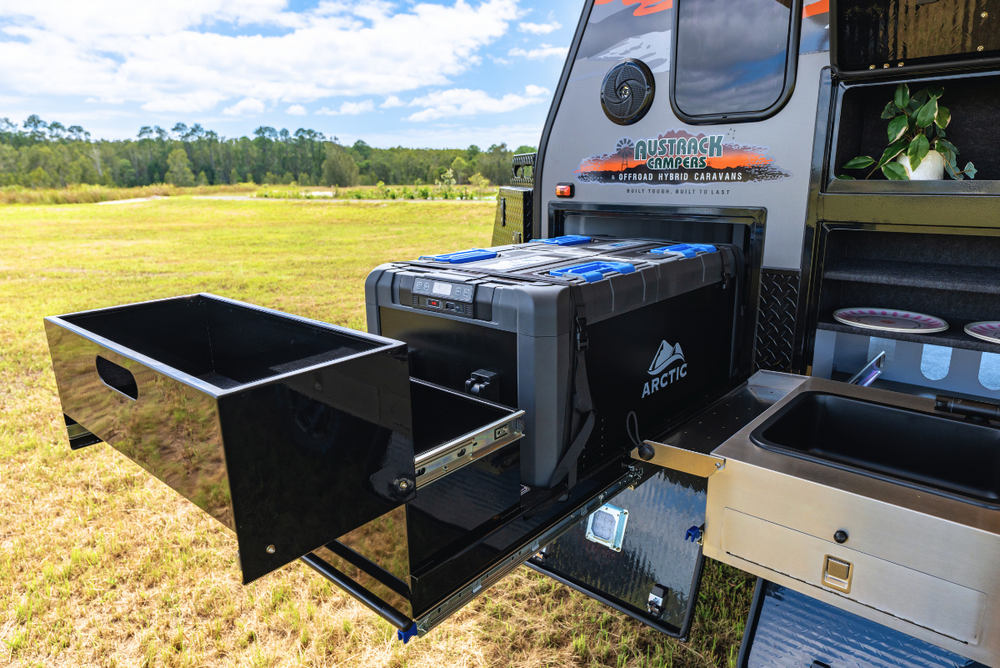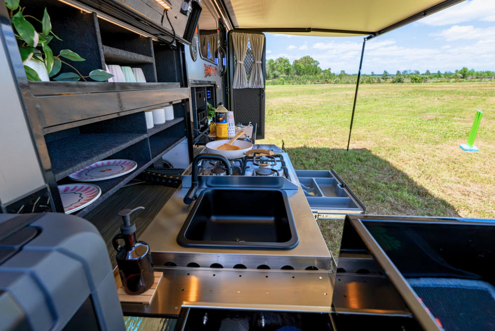 Designed for the ultimate outdoor experience, this pull-out stainless steel kitchen is built for campsite cooking at its finest. Featuring a convenient cutlery drawer, hot & cold tap, large sink, and an AGA-approved multi-burner cooktop, it's ready for everything from a quick brew to a gourmet campfire feast.